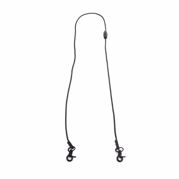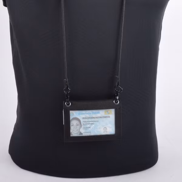Lanyard med två svarta metallkarbinhakar för ID-hållare.