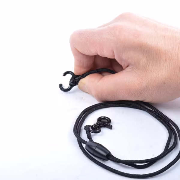 Denna högkvalitativa produkt använder inte en karbinhake med sidoöppning utan en karbinhake av saxtyp med en halvcirkelformad sväng som gör det lättare att trä in i hålen för ID-hållare.