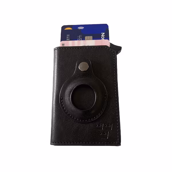 Kombinerad plånbok och korthållare av högkvalitativt PU-Läder med Airtag hållare. Pop-up funktion gör att korten glider gradvis ut och bli lättåtkomliga genom spakfunktionen. Korthållaren rymmer 4-6 kort, är av aluminium och skyddar dina kort från att böjas och brytas av. Dessutom förhindrar den trådlös identitetsstöld genom att fungera som en brandvägg för dina RFID kort. Med ett enkelt klick skjuts alla dina kort ut gradvis vilket gör att du enkelt får tag i kortet du ska använda. Extra plats för ytterligare 4-6 kort. Levereras i presentförpackning.