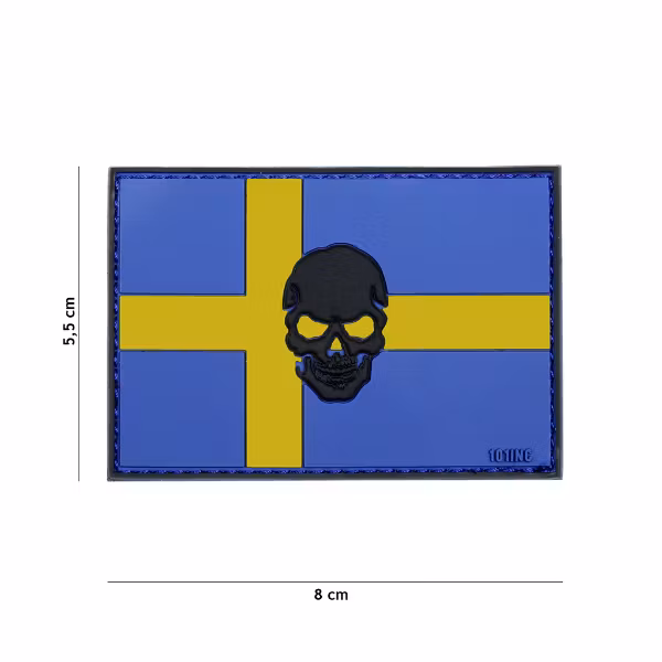 Utrusta din jacka, väst, ryggsäck eller andra plagg och utrustning med denna snygga modell av den svenska flaggan med döskalle patch.