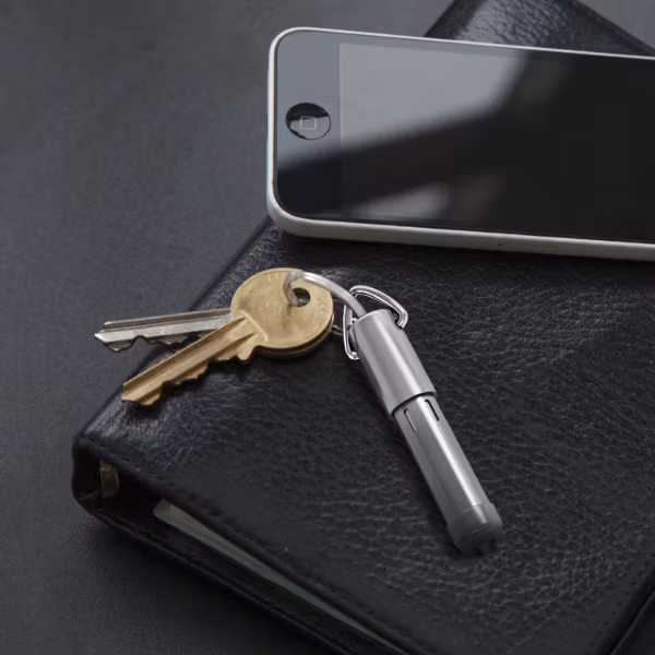 Den lossnar helt enkelt från sitt kraftfulla magnetiska lock och sträcker sig till full längd med bara ett drag. Förvarra i nyckelringen och ha alltid en bekväm penna i full storlek till hands. Tillverkad av borstat rostfritt stål och anodiserat yttre hölje av flygplansaluminium. 3x extra svart påfyllningsbläck ingår.