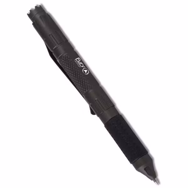 Taktisk räddningspenna med en härdad vass krona som kan användas som glaskrossare eller vid självförsvar.