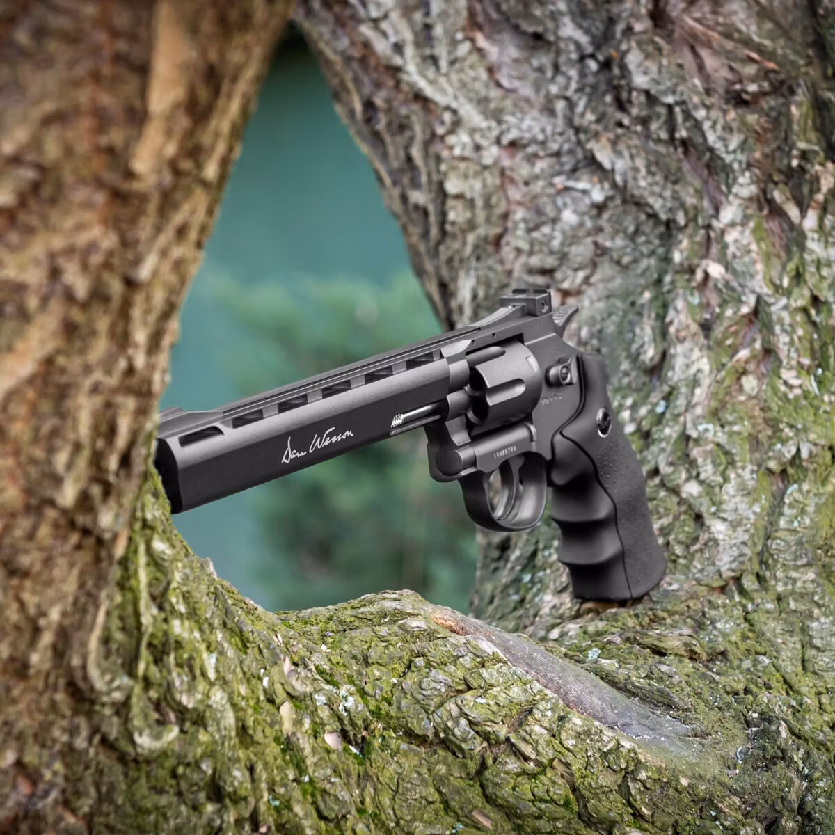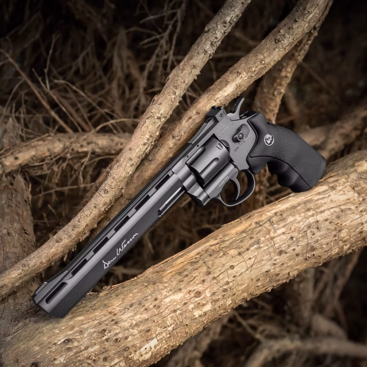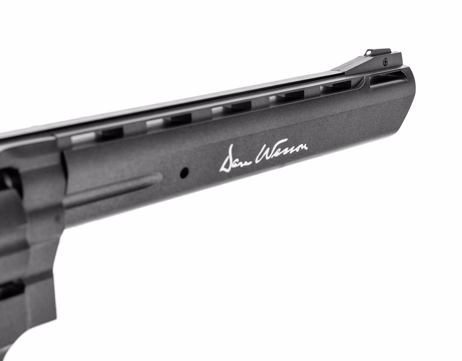 Heavy fully metal, licensed replica of the Dan Wesson revolver powered by CO2 gas from a 12g cartridge placed in the grip, generating an initial BB velocity of 540 fps.