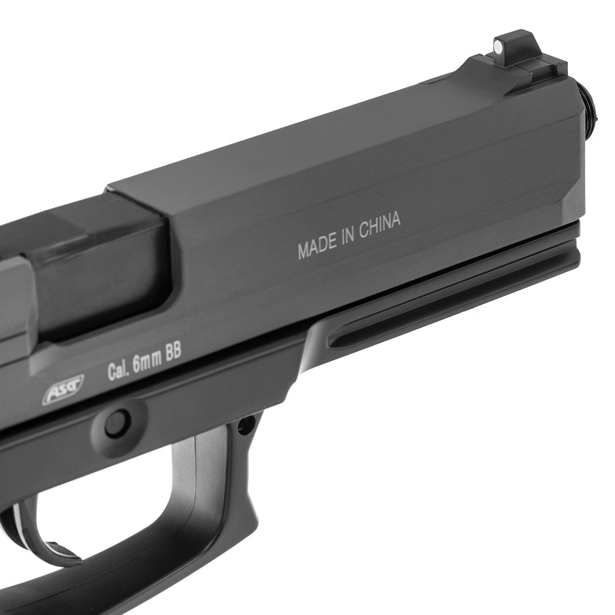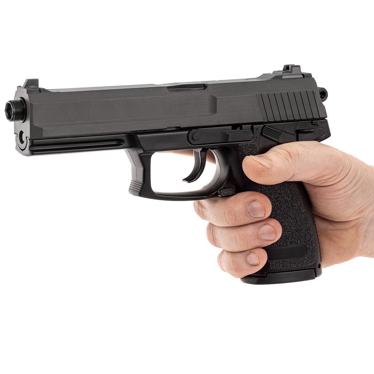 This pistol requires the piston spring to be cocked before each shot by pulling back the slide. This movement also feeds the BB into the barrel, from where it is fired at a speed of approx. 190 fps. The magazine holds 27 BBs and can be removed using a button in the form of wings located on the trigger guard.