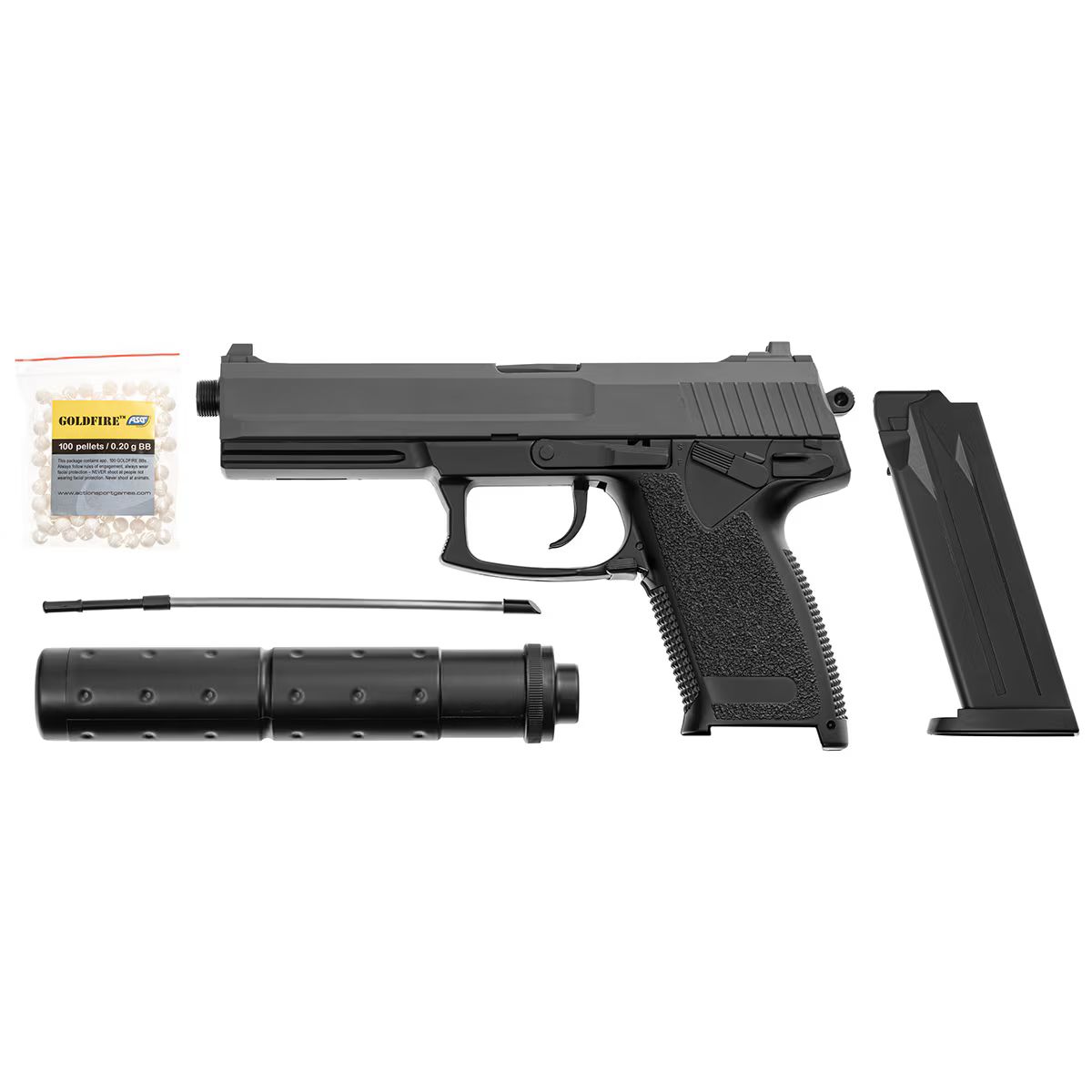 The suppressor included in the set is not just a dummy like those found in many other replicas. It has a built-in additional barrel which, thanks to a clever mounting system, extends the actual barrel when screwed into the pistol. Thanks to this solution, the barrel length is increased by several centimeters, which positively affects the accuracy of the shot.