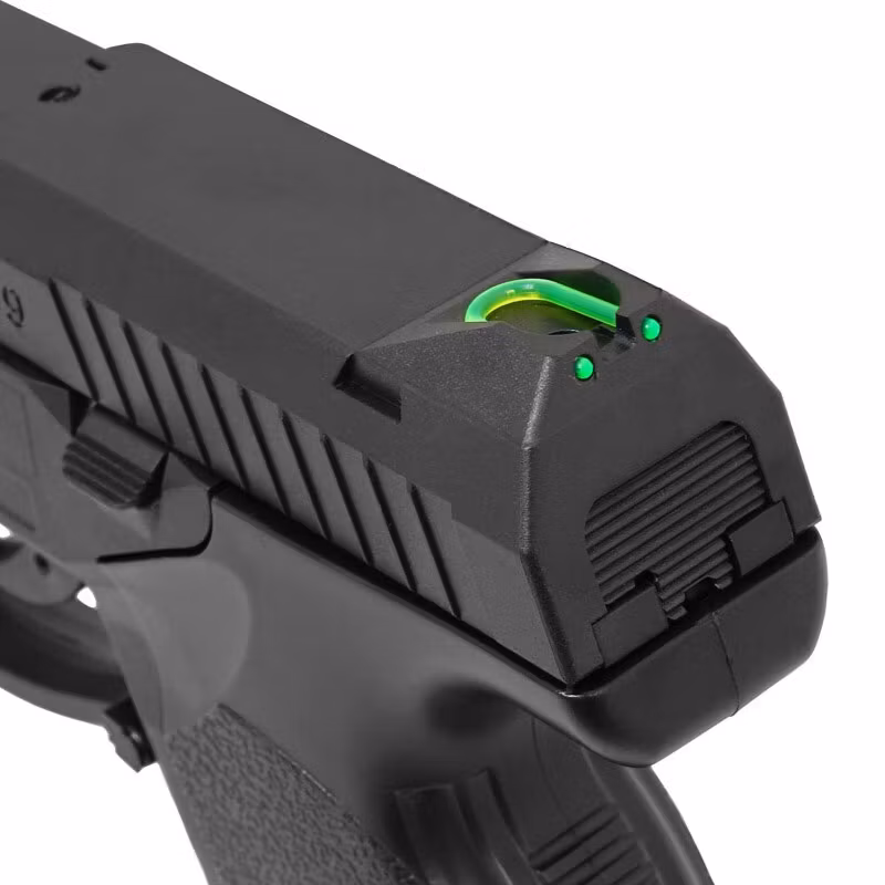 The pistol is equipped with fixed, mechanical sighting devices in the form of a fiber optic rear sight and a front sight with a white dot applied. The high contrast speeds up sight alignment and significantly facilitates aiming in low light conditions.