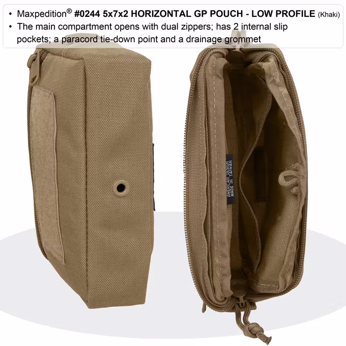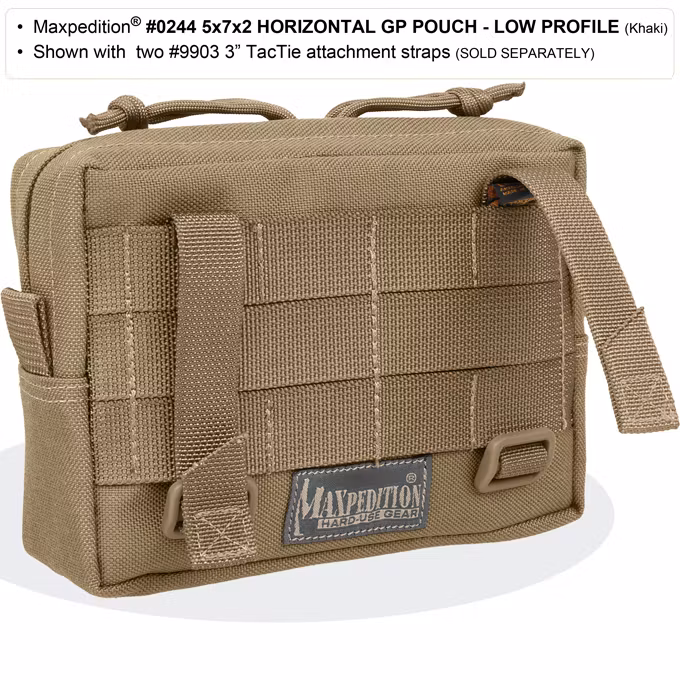 The #0244 5x7x2 Horizontal Low Profile GP Pouch is a general purpose pouch. Main compartment opens with dual zippers; has 2 pack cloth dividers and a paracord tie-down point. Front of pouch features a zippered slip pocket with 2" x 5" velcro loop area for patches. Attaches to MOLLE/PALS system using two (2) 3" TacTie Attachment Straps (sold separately, part no. #9903)