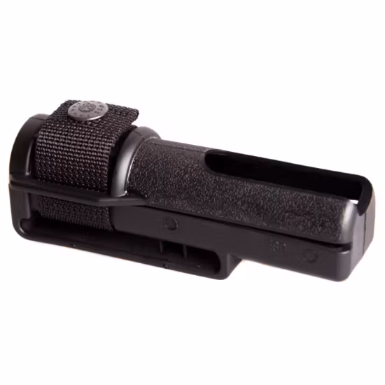 The holster's design opens automatically when the strap is unfastened, allowing the baton to be quickly removed from the holder with one hand. In addition, the position with the strap unfastened allows the unfolded baton to be inserted into the holster.