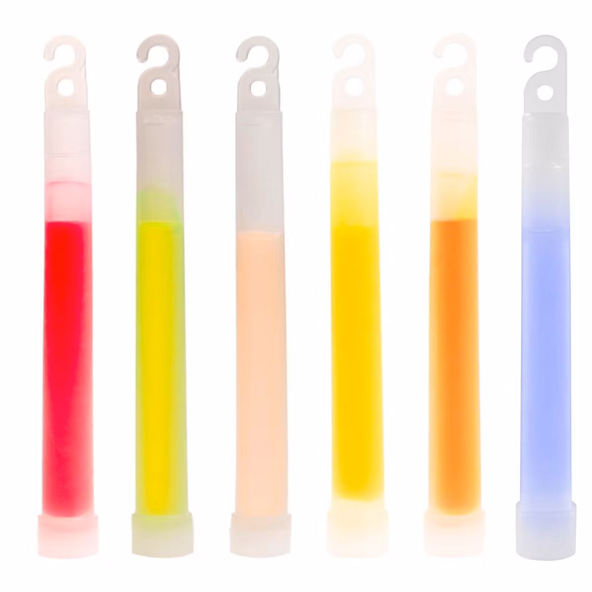 A set of 6 lightsticks in various colors, providing light regardless of weather conditions and ambient temperature. Thanks to the chemical reaction, it requires no power, batteries, or complex mechanisms. To activate the light, simply break the internal glass capsule containing the chemical substance, then shake the tube to mix the ingredients. The result is a bright, even light that spreads in a 360-degree radius.