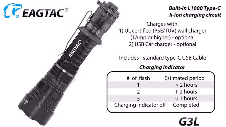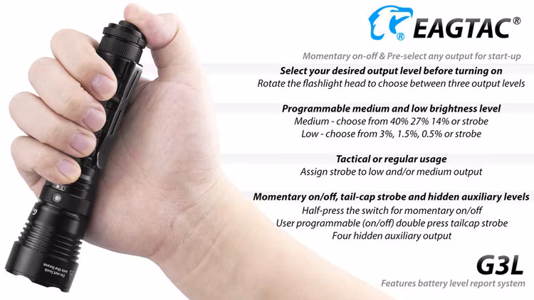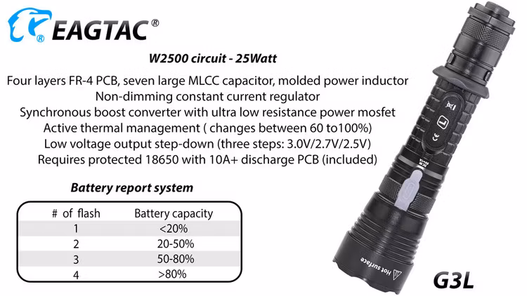En status-LED är installerad i lamphuvudet på G3L, vilket indikerar batteriets laddningsstatus genom att blinka. Tack vare de tre olika ljusnivåerna kan G3L anpassas till olika situationer. G3L är också utrustad med en temperaturreglering som arbetar i intervallet 70% och 100% för att skydda lampan från skador orsakade av övertemperatur.