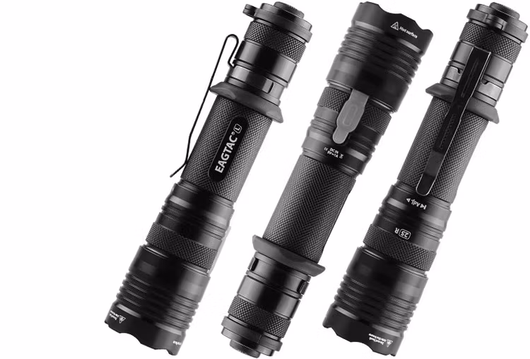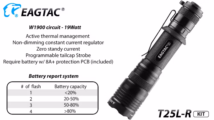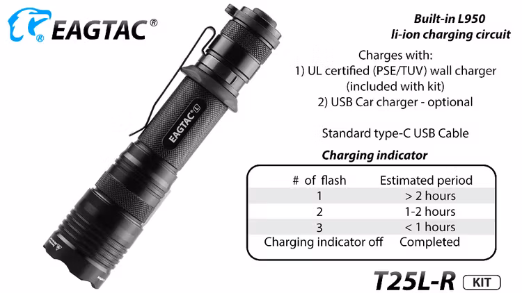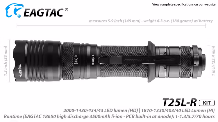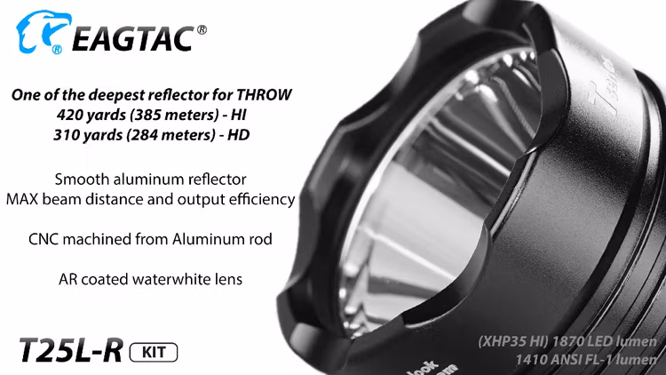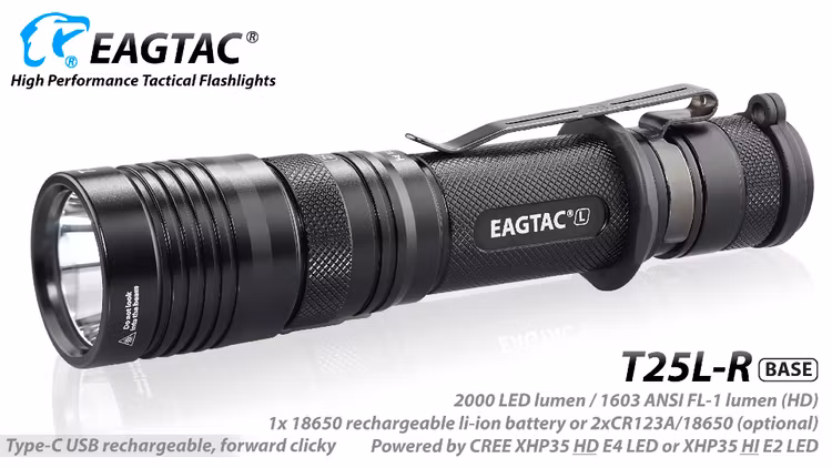 EAGTAC T25LR är en kompakt ficklampa med hela 2000 Lumens. Slitstark och robust. Kommer med både en avtagbar fästklämma samt en lanyard för en mängd olika bäralternativ. Lampan har en slät aluminiumreflektor som ger maximal effekt och strålavstånd. Laddningsbar via USB.
