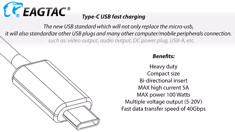 - Fast charging with Type-C USB. Heavy duty, compact, bi-directional insert, Max high current 5A, max power 100 watts, fast data transfer speed of 40 Gbps.