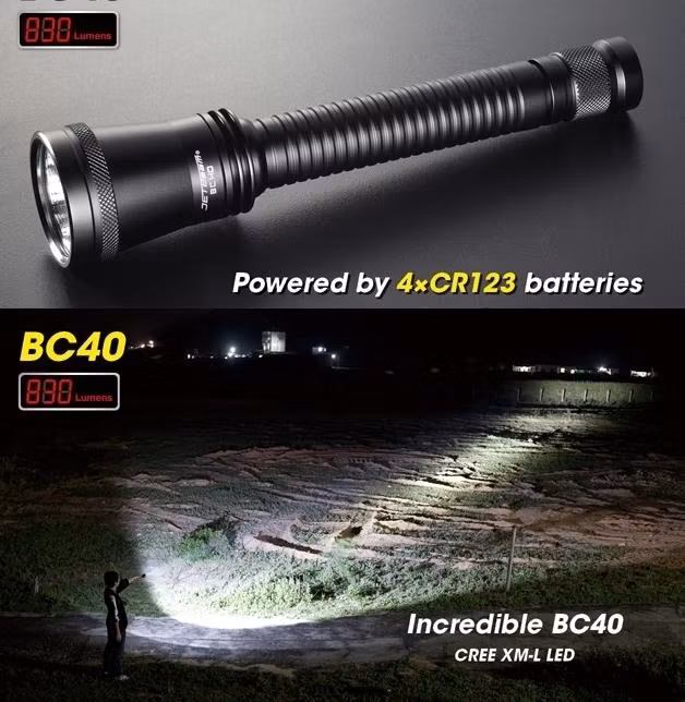 Jetbeam BC40 är en kraftfull ficklampa som kan leverera upp till 830 lumen. Den har en räckvidd på 344 meter. Om det inte krävs högsta ljusstyrka, har BC40 ett sekundärt läge som räcker i 11 timmar (130lm) och har då en kastlängd på 115 meter. Du växlar mellan de två olika lyslägena genom att dra åt (hög-läge) eller lossa (låg-låge) lamphuvudet.