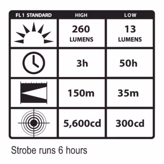 • HÖG - 260 lumen; 5,600 candela ljusintensitet; fungerar i 3 timmar
