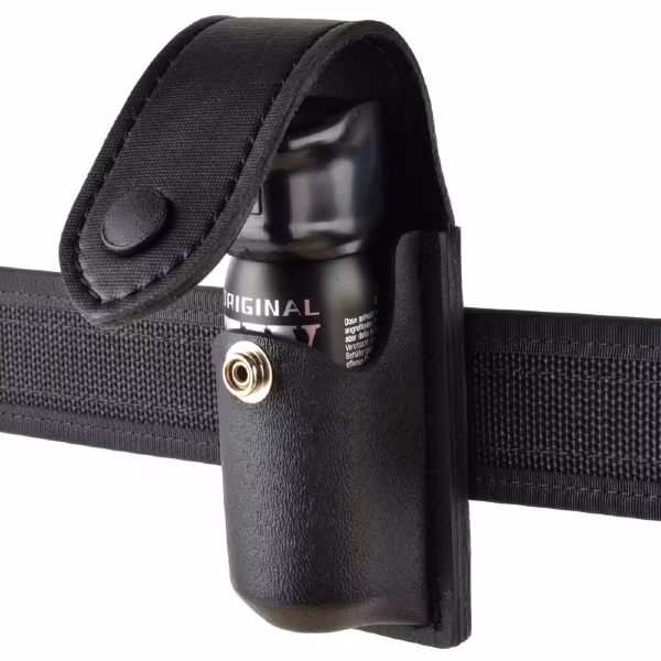 OC-hållare från Safariland med lock i svart nylon för bälte.