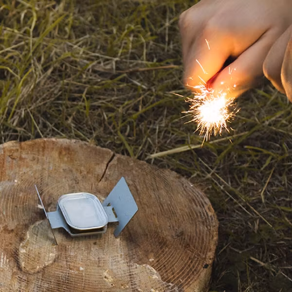 Levereras med en skrapare som är fäst i handtaget. Dra den mot eldstålet så uppstår gnistor som tänder eld på ditt tände.