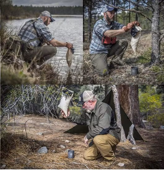 Vattenfilterpåsen gör det möjligt att initialt förbereda vatten för konsumtion. Baserat på en design som användes av den brittiska armén under andra världskriget har detta filter försetts med en integrerad bärväska och ett snöre för att snabbt fästa på en gren eller annan upphängning.