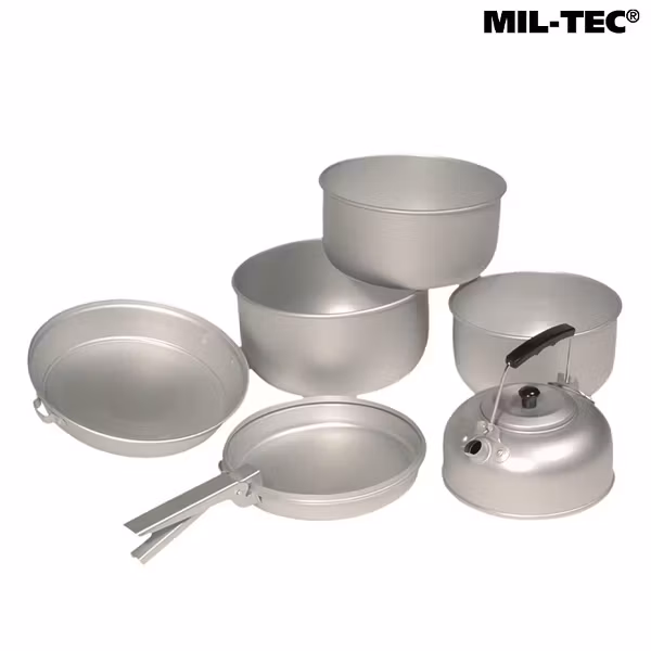 Ett fantastiskt matlagningsset i aluminium för äventyren, campingen eller stugan. Ät dina måltider utomhus med denna fantastiska uppsättning av köksutrustning.
