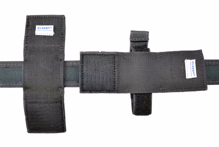 Infästningen har en kardborreförslutning och kan fixeras eller avlägsnas från bältet utan att man behöver ta av bältet.