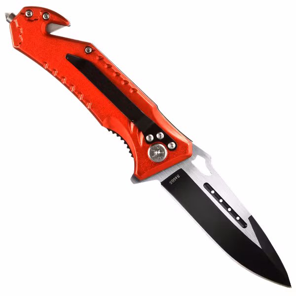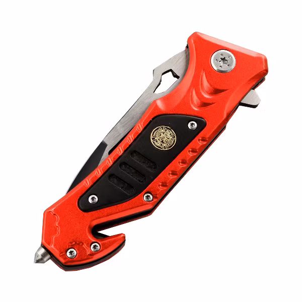En bälteskärare finns integrerad i handtaget samt en pigg för glasskross i handtagets nederdel. Perfekt för att skära sig loss från bältet samt krossa rutan för att ta sig ut vid en bilolycka. Denna räddningskniv är perfekt vid nödläge. Bärs praktiskt i byxlinningen eller i fickan med hjälp av knivens bältesklämma.