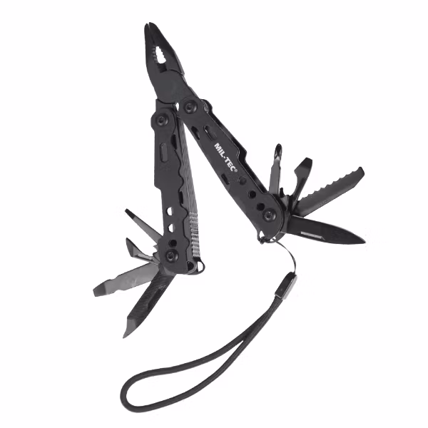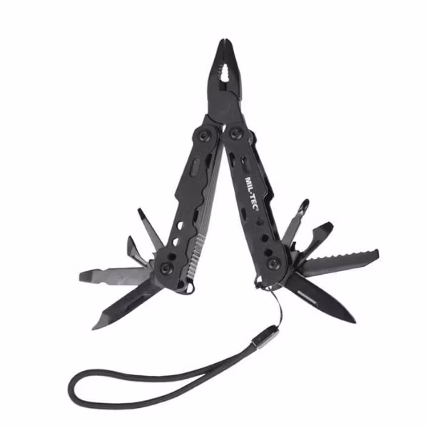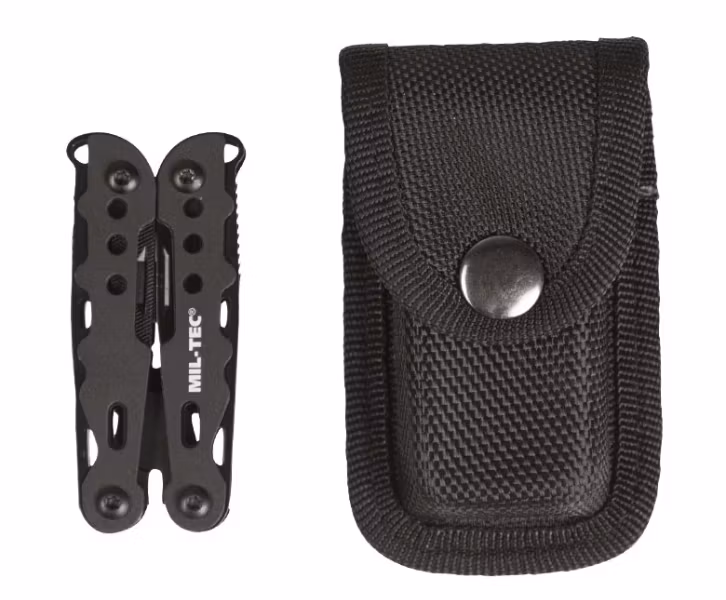 - Tång, fil, 2 platta skruvmejslar och en stjärnskruvmejsel, konservöppnare, flasköppnare, kniv och såg.