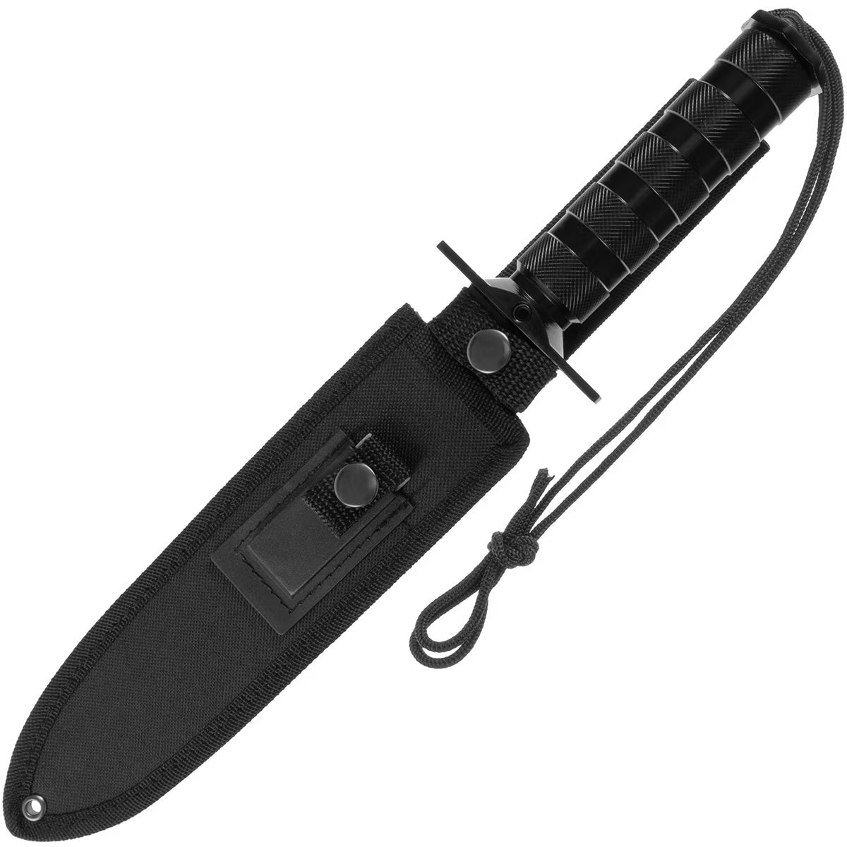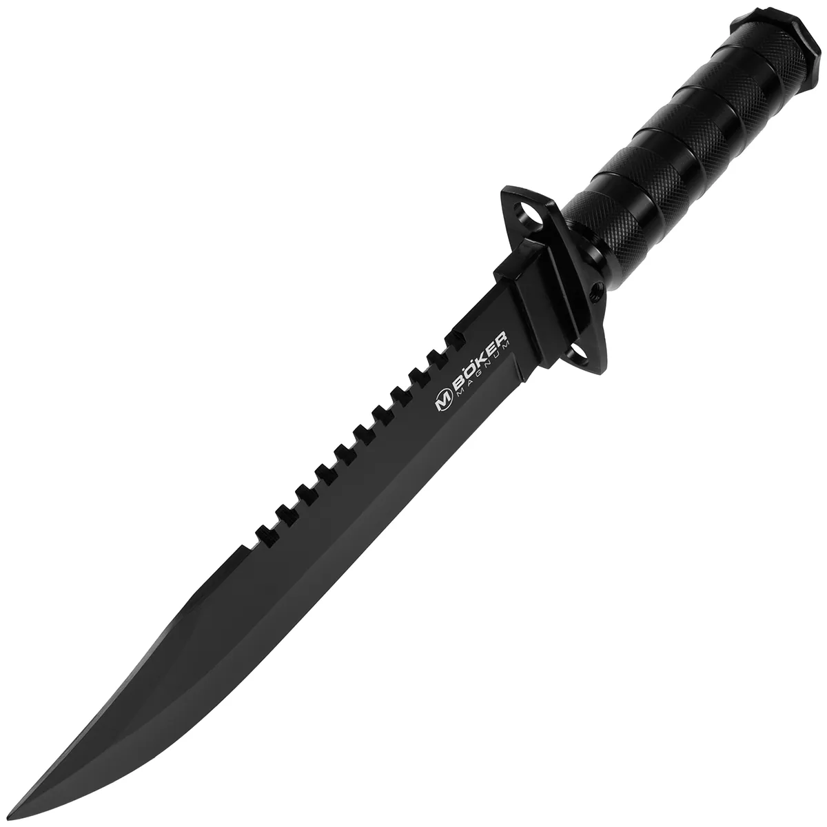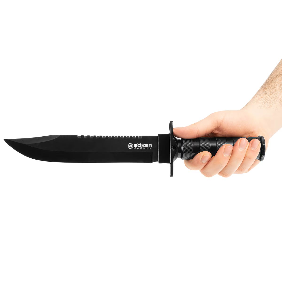 A large outdoor knife with a fixed blade. The Bowie profile blade is made of 440A stainless steel coated with black paint. The back of the blade features a wood saw, useful in survival situations.