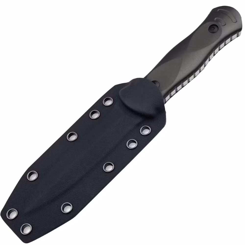 The knife scales were made of black anodized aluminum, and thanks to their profiling and notches on the sides of the tang, the knife fits well in the hand, even in adverse weather conditions.