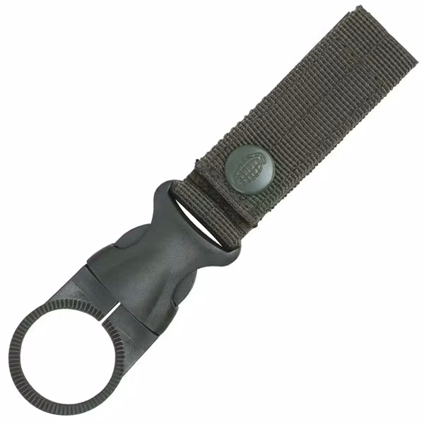 Flaskhållaren har ett taktiskt spänne på nylonbandet för att enkelt kunna fästa på bältet eller via MOLLE- system. Passar bäst till normalstora PET-flaskor upp till 1 liter.