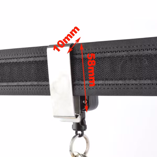 The revolving stainless steel belt clip allows the retractor to be easily attached to a belt up to 58 mm wide.