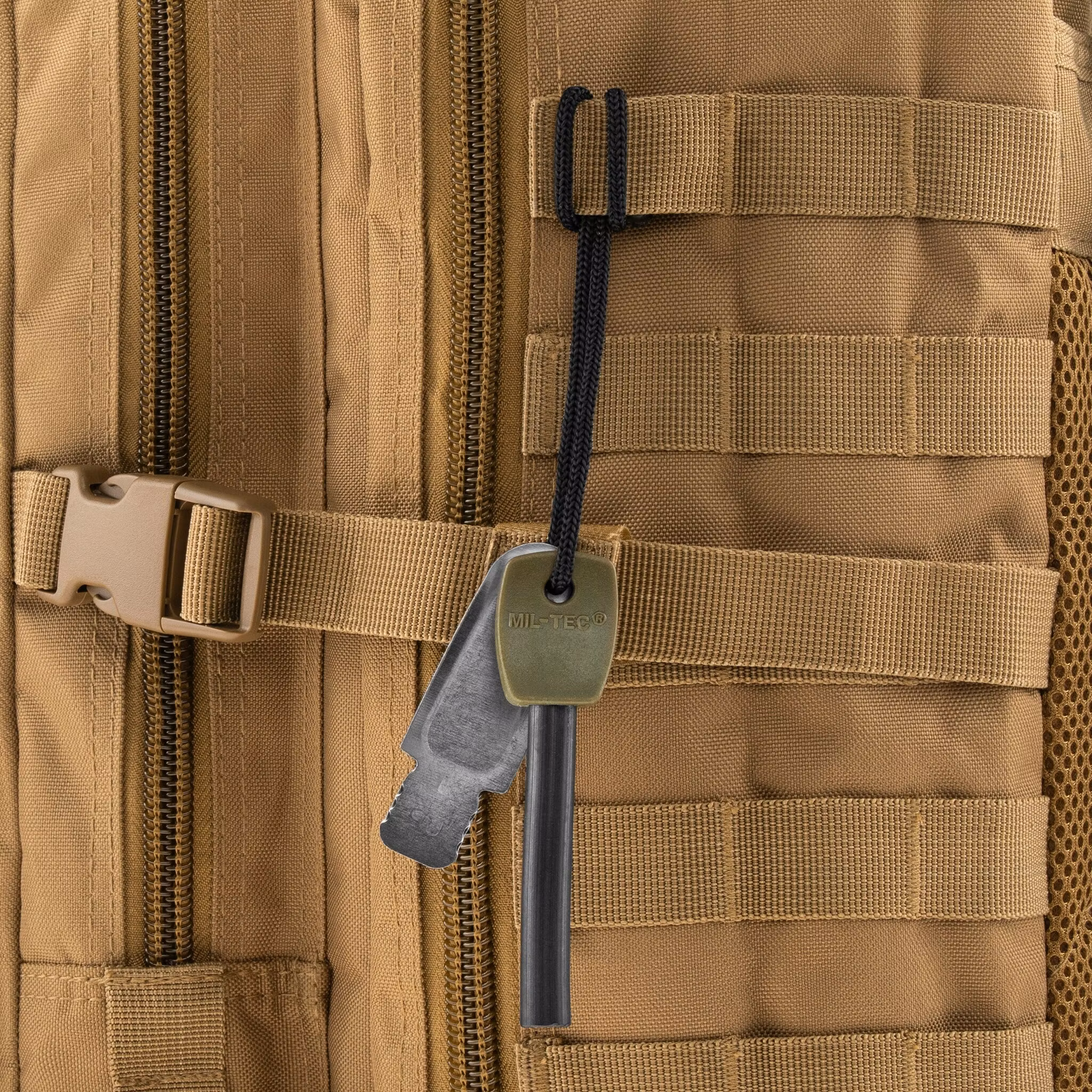 Firesteel with a 9 mm diameter ferrocerium rod that gives a large sheaf of sparks at 3000 degrees C. It works in harsh atmospheric conditions such as rain and wind and at high altitudes. With the help of the firesteel, you can light, for example, a gas stove, a tourist stove or a campfire, which is a source of heat and allows you to prepare a meal away from home.