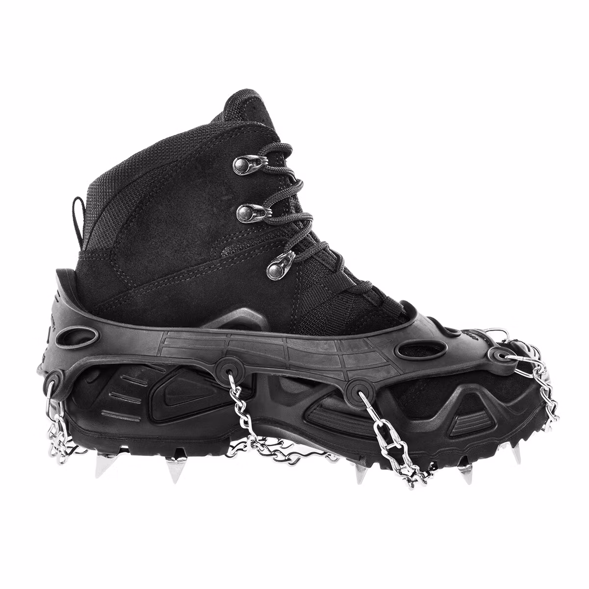 Mountain hiking and trekking: They allow safe movement on moderately steep ascents and descents. When trekking with a load, the crampons increase stability, which is especially important when balancing a heavy backpack on uneven, slippery terrain.