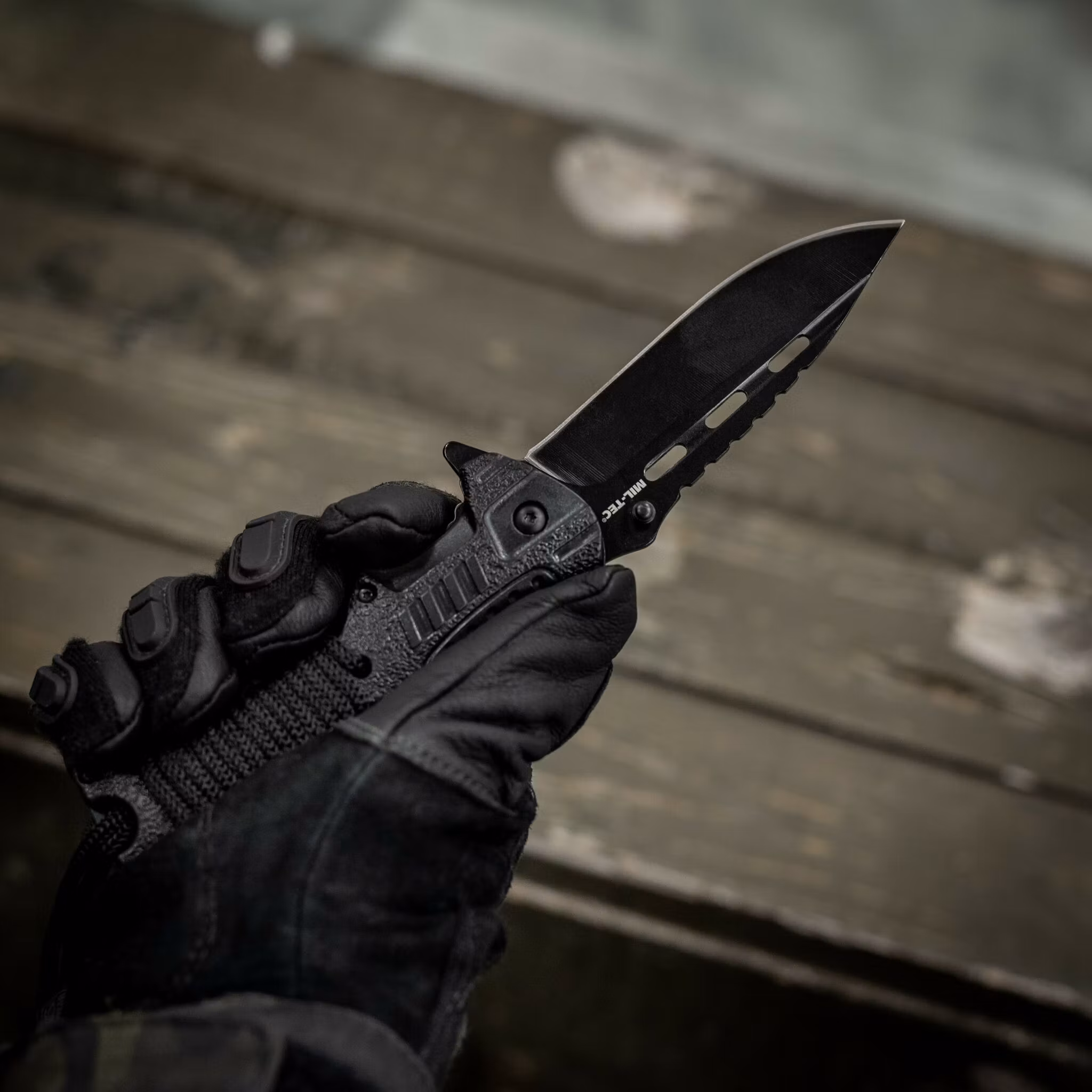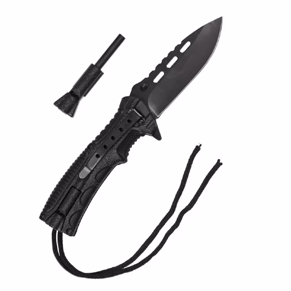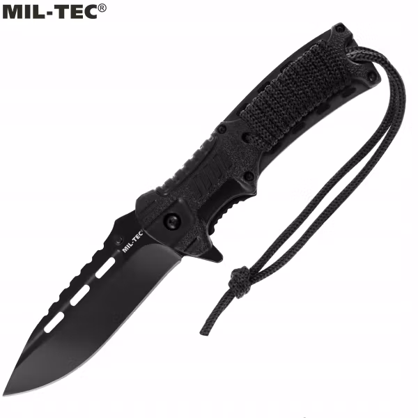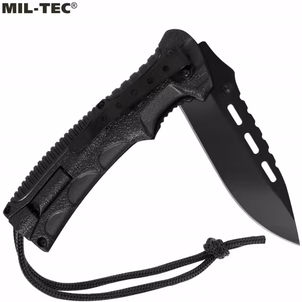 Taktisk fällkniv från MIL-TEC med svart blad och avtagbart eldstål på handtaget. På eldstålet finns även en liten visselpipa integrerad. Kniven har även linerlås samt paracord rep integrerat i handtaget. Perfekt kniv för EDC – EveryDay Carry att ha nära till hands om en överlevnadssituation skulle inträffa för att kunna göra upp eld och värma sig till att bygga läger för övernattning. Rekommenderas!!