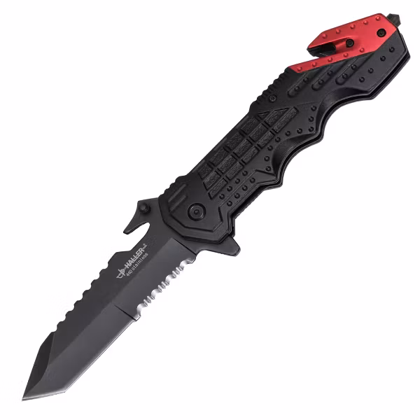 En kraftfull och robust räddningskniv med ett delvis tandat blad tillverkat av 440 rostfritt stål. Tack vare fjäderstödet kan bladet öppnas blixtsnabbt med hjälp av flippern och låses säkert av linerlåset. När den är utfälld fungerar flippan även som ett pareringselement och skyddar handen från att glida. En bälteskärare sätts in i handtaget av lättmetall, det finns en glaskross i handtagets ände. Perfekt verktyg vid nödläge i olika behov.