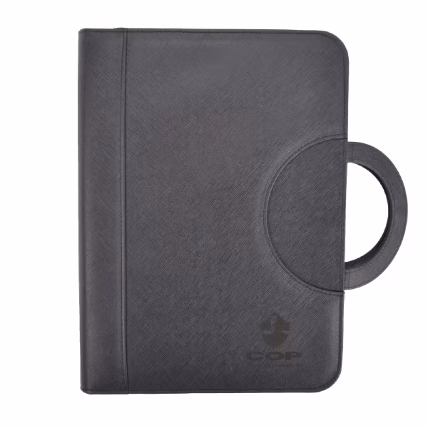 COP dokumentmapp gjord av slitstark polyuretan/syntet med justerbar smartphonehållare i A4-format. Den har även två infällbara bärhandtag som hålls på plats av en magnet när de är vikta. Mappen stängs med en 2-vägs dragkedja så att allt förblir säkert i mappen och du har allt klart framför dig på mötet på ett elegant sätt.
