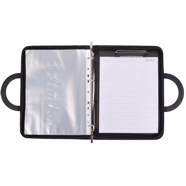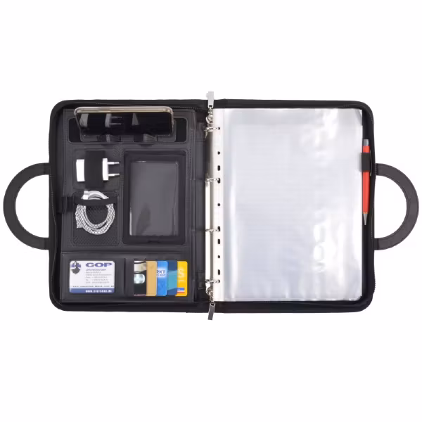 Mappen har många smarta och funktionella förvaringsfack för det mesta som man kan behöva ha med sig på ett affärsmöte. Exempelvis hållare för laddningskabel och powerbank, litet fack för småpengar, sex kortplatser för visitkort, fack för surfplattor upp till 29 x 19 cm etc. Dessutom har mappen en 4-ringmekanism av metall för arkivering av dokument. Rekommenderas!!