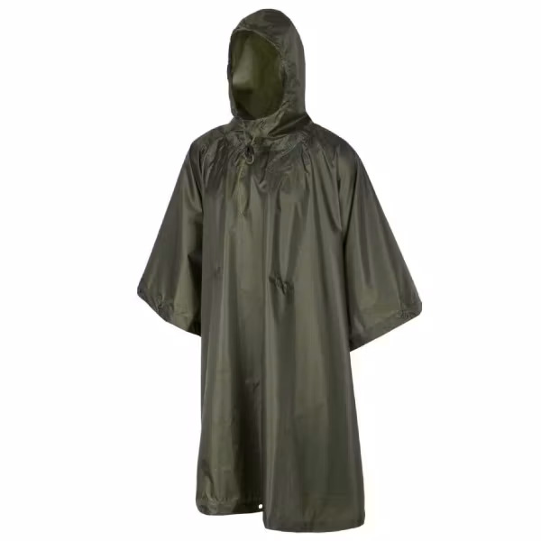 Regntät, snabbtorkande poncho, tillverkad av Rip-stop polyester. Den har tryckknappar som möjliggör en kombination av två ponchos. Huvan är utrustad med snörjustering.