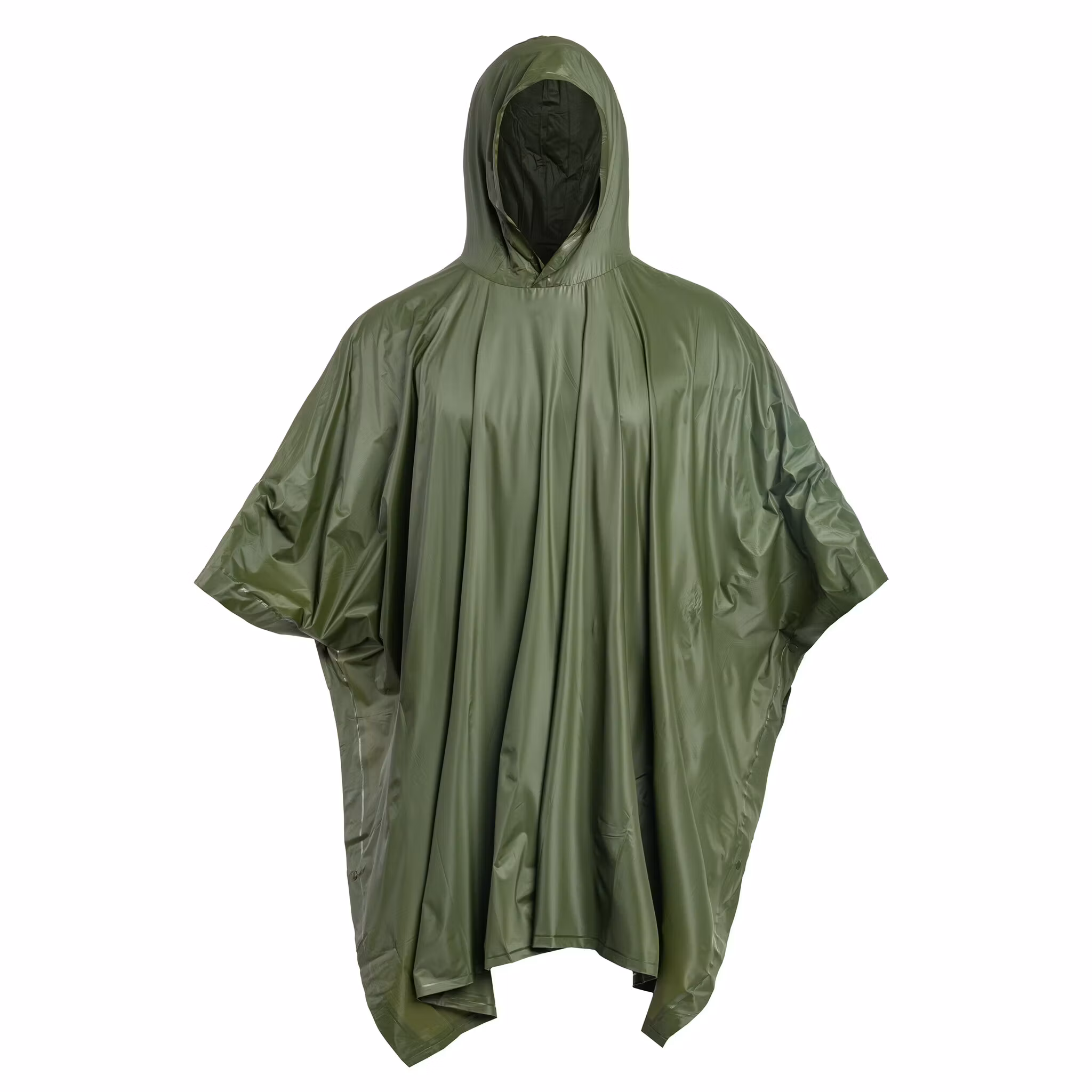 The poncho characterizes itself with a water resistance of 1600 mm/m2, glued waterproof seams and solid press studs to fasten the sleeves and adjust the poncho to the wearer.