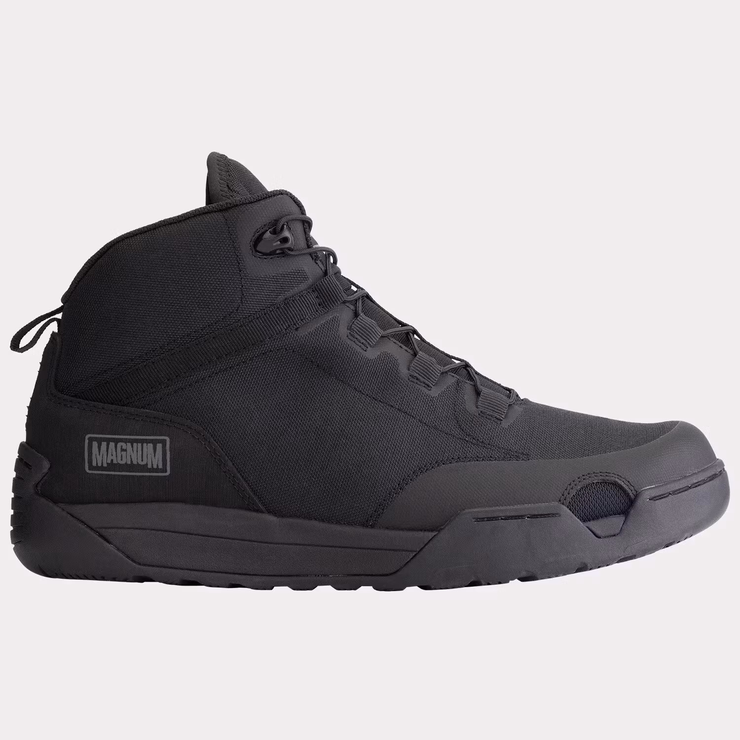 Lightweight tactical boots in black, made of mesh, providing adequate air circulation and proper moisture wicking. The height of the upper stabilizes the ankle joint and provides protection against injury, but does not restrict freedom of movement. The footwear will prove suitable for use by employees of various types of uniformed services, the security industry, bushcraft and survival fans and tourists.