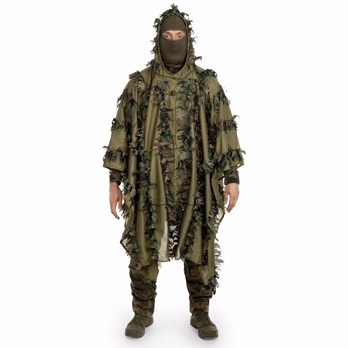 Camouflage poncho made of the same materials as jacket and pants. The surface is also covered with paracord rows that can be used for attaching additional camo, to better adapt it to the surrounding environment. Poncho is great for concealing observation points. Ghillie Suit Poncho can be combined with standard USGI Poncho or our Swagman Roll®. The front part of the poncho can be rolled to create camouflage overlay. There is a possibility to join together few of Ghillie Suit Ponchos in order to conceal larger areas.