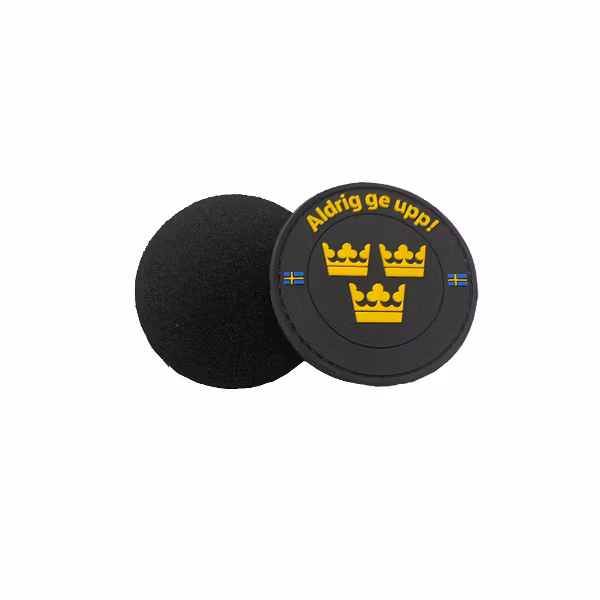 En snygg och stilrent PVC 3D Svensk gummi märke med tre kronor, med kardborre på baksidan.