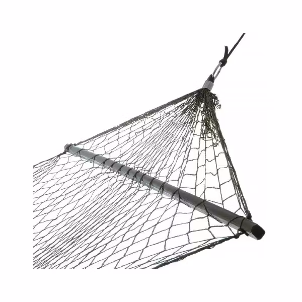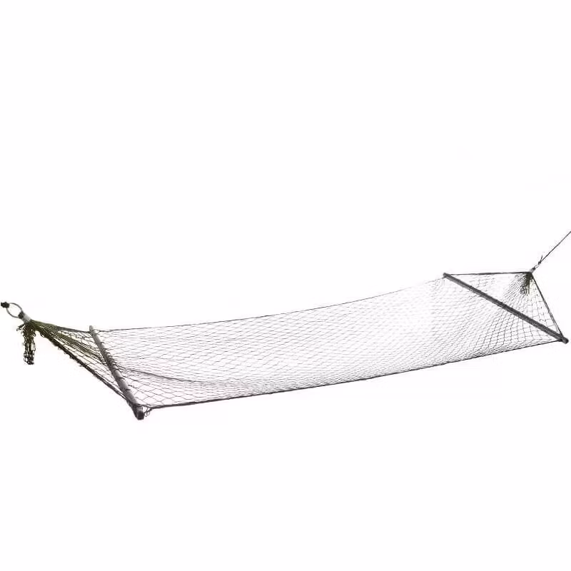 Hammock made from durable olive nylon cord. Equipped with two foldable spreader bars made of light yet strong plastic.