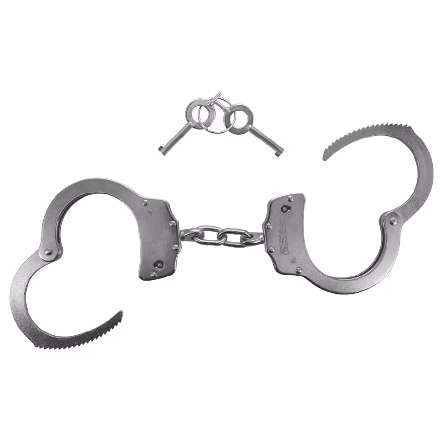 Metal handcuffs equipped with a chain connecting the bracelets, consisting of two links that have been welded for reinforcement. The bracelets fit wrists with a width of 46 to 76 mm. The set includes two standard keys.
