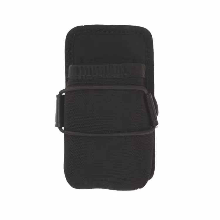 Öppet radioshölster med justerbart elastiskt band och tryckknappsstängning för att säkra radion i höljet.