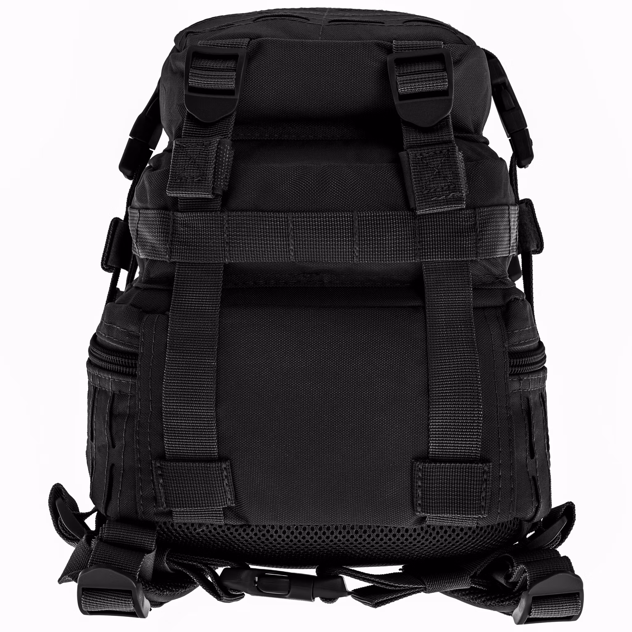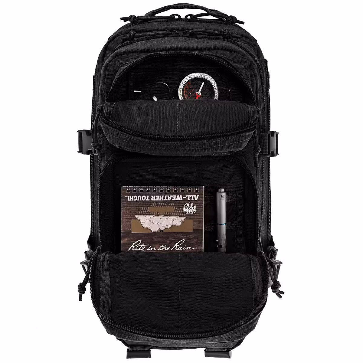 Denna starka och vattenbeständiga 21-liters assault ryggsäck har två stora fack med robusta tvåvägs dragkedjor med slitstarka och handskvänliga paracorddrag med meshfickor, två små framfickor samt en inbyggd kardborrficka för en vattenblåsa.