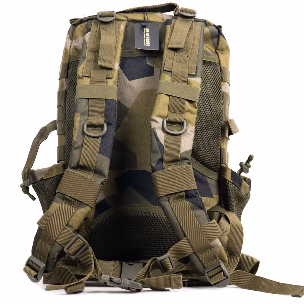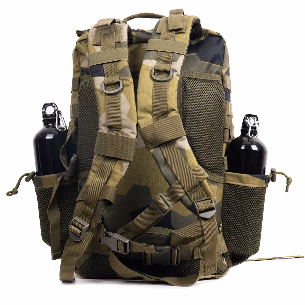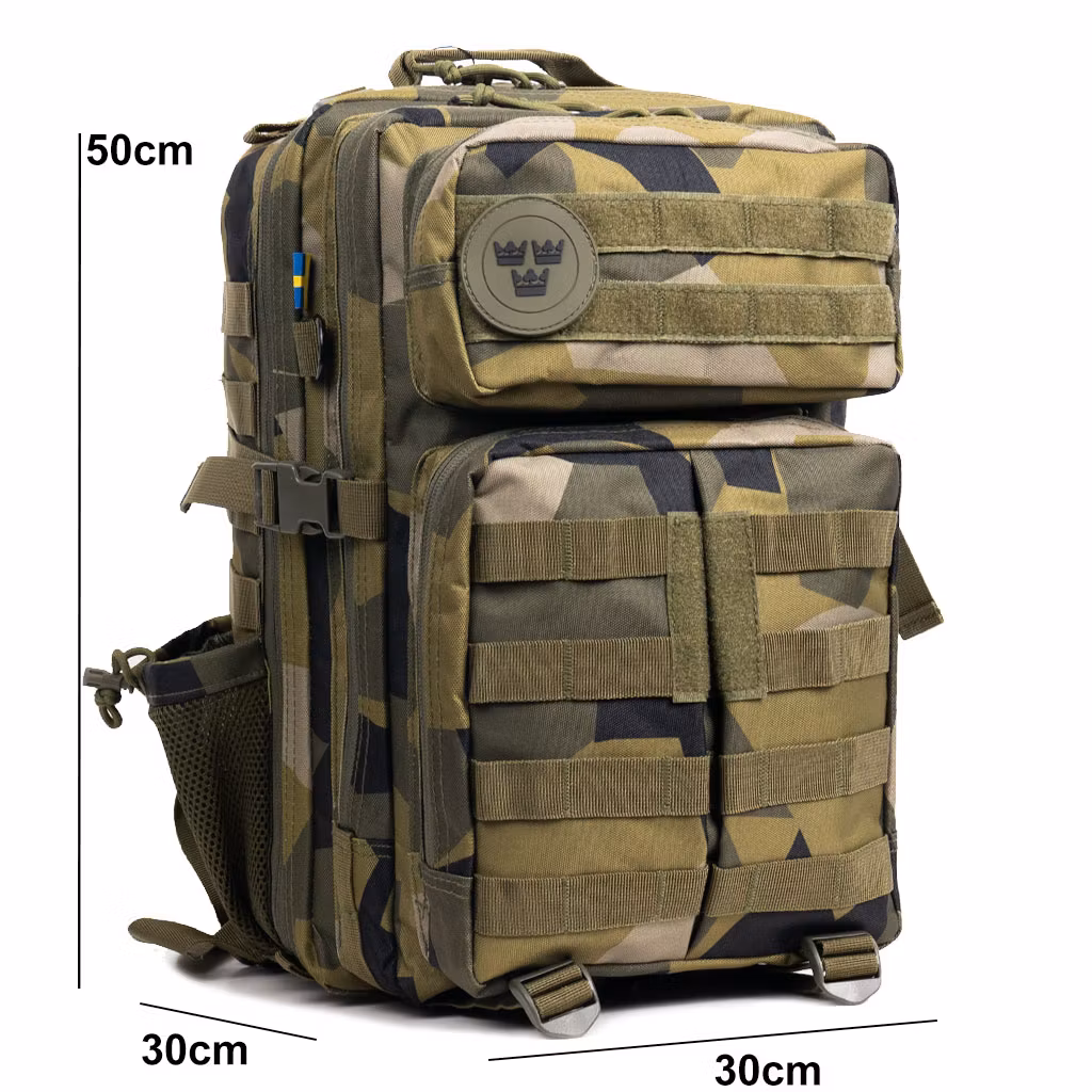 Ryggsäcken är tillverkad av 600D polyestermaterial, taktisk ryggsäck är förstärkt och dubbelsydd vid alla stresspunkter. Resistent och tufft och specialbeläggning gör träningsryggsäcken både vattentät och repfri.