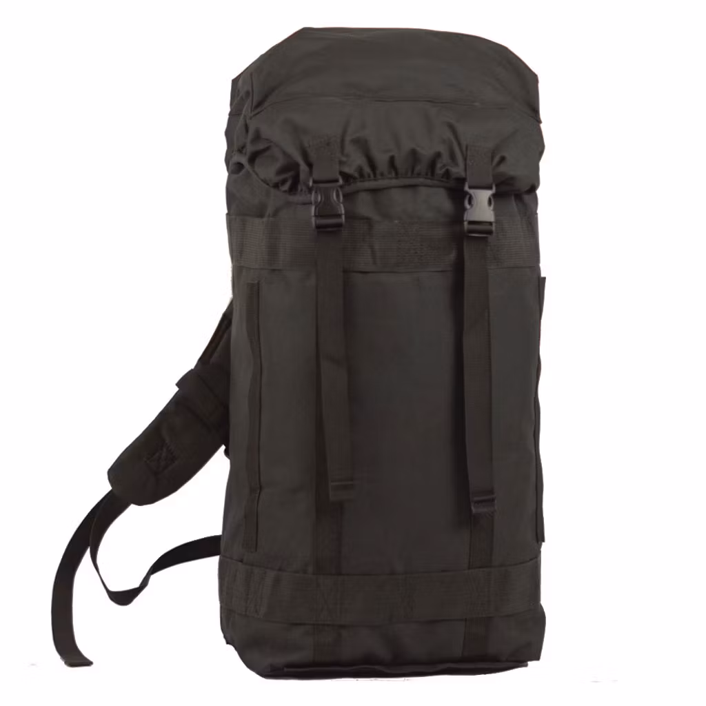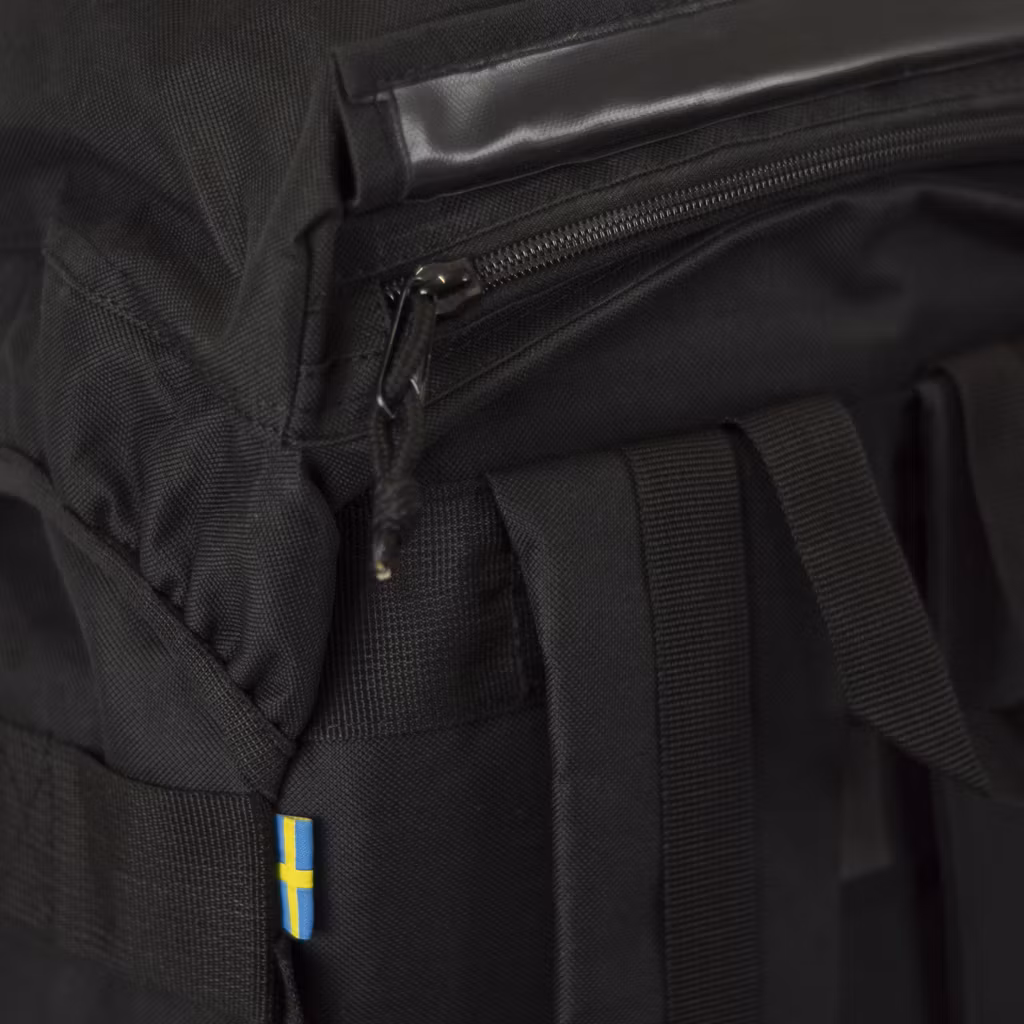 Nyproduktion av Stridssäck 2000 i svart färg. En smidig och slitstark ryggsäck tillverkad i kraftig 600 nylon väv. Vadderade axelremmar för högsta komfort. Intern aluminiumram gör stridssäcken stabil och ger bästa bärergonomi. Toppficka med blixtlås på locket. Yttre fästmöjligheter i tvärgående band och vertikala knapphålsband. Volym ca 35L.