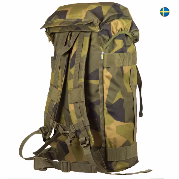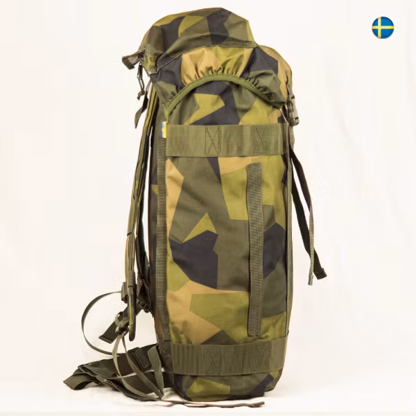 Nyproduktion av Stridssäck 2000 i M90 kamouflage. En smidig och slitstark ryggsäck tillverkad i kraftig 600 nylon väv. Vadderade axelremmar för högsta komfort. Intern aluminiumram gör stridssäcken stabil och ger bästa bärergonomi. Toppficka med blixtlås på locket. Yttre fästmöjligheter i tvärgående band och vertikala knapphålsband. Volym ca 35L.