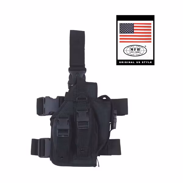 Taktiskt benhölster för pistoler från MFH (Max Fuch). Hölstret är justerbart i djup och har två magasinfickor på sidan och ytterligare en magasinficka på framsidan, alla med snabbspännen och dräneringshål. Hölstret kan fästas på låret genom två justerbara benremmar med snabbspännen.