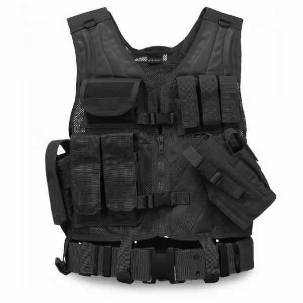 Taktisk Cross draw stridsväst i 100% polyester. Utrustad med 3st magasinfickor passande för G36/M4/M16/AK-47 magasin, 3st fickor för pistolmagasin samt en universalficka. Västen har även ett avtagbart pistolhölster med en magasinficka på hölstret.