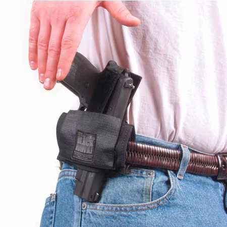 Designed to work on any belt up to 2 inches. wide and fits most small to medium frame automatics and revolvers. Adjustable thumb break which is fully ambidextrous. Made of ballistic Nytaneon.